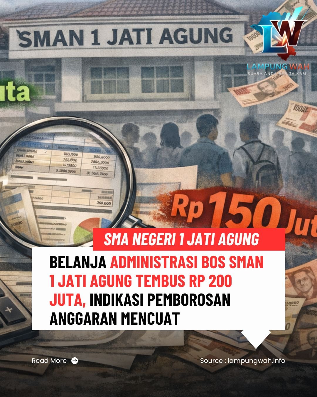 Lampung Selatan, lampungwah.info – Pengelolaan Dana Bantuan Operasional Sekolah (BOS) Tahun Anggaran 2025 kembali menjadi sorotan publik. Kali ini perhatian tertuju pada SMA Negeri 1 Jati Agung, Kabupaten Lampung Selatan, setelah belanja pada pos Administrasi Kegiatan Sekolah tercatat menembus angka lebih dari Rp 200 juta dalam satu tahun anggaran.