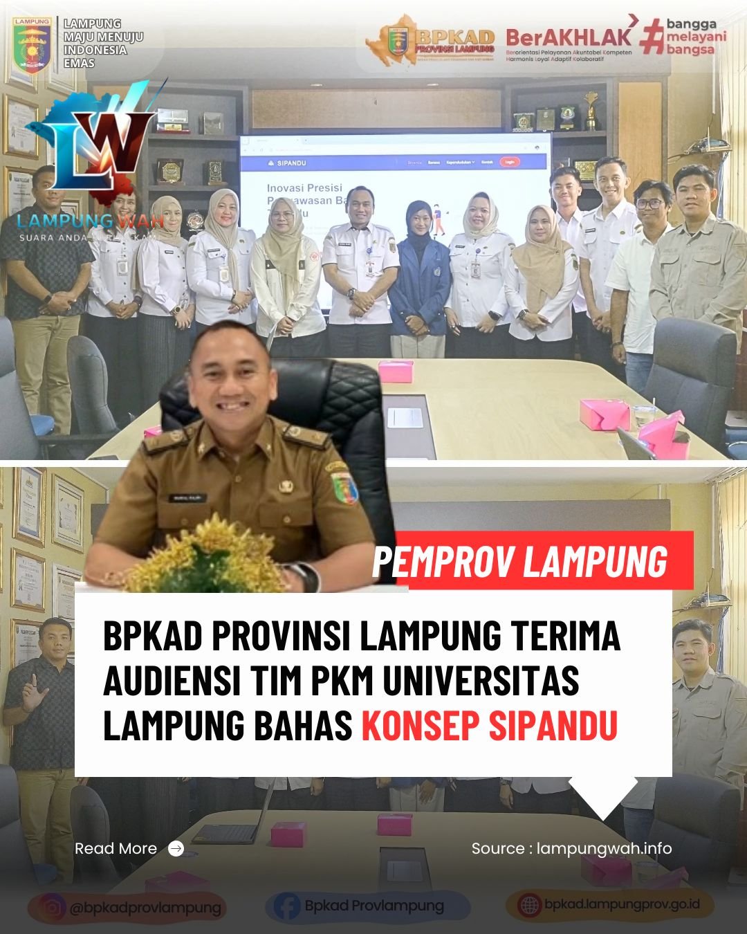Bandar Lampung, lampungwah.info — Badan Pengelolaan Keuangan dan Aset Daerah (BPKAD) Provinsi Lampung menerima audiensi dari Tim Program Kreativitas Mahasiswa (PKM) Universitas Lampung dalam rangka pemaparan dan pendalaman konsep Sistem Informasi Penyaluran Bantuan Terpadu (SIPANDU), Rabu (14/1/2026), di Ruang Rapat Kepala BPKAD Provinsi Lampung.