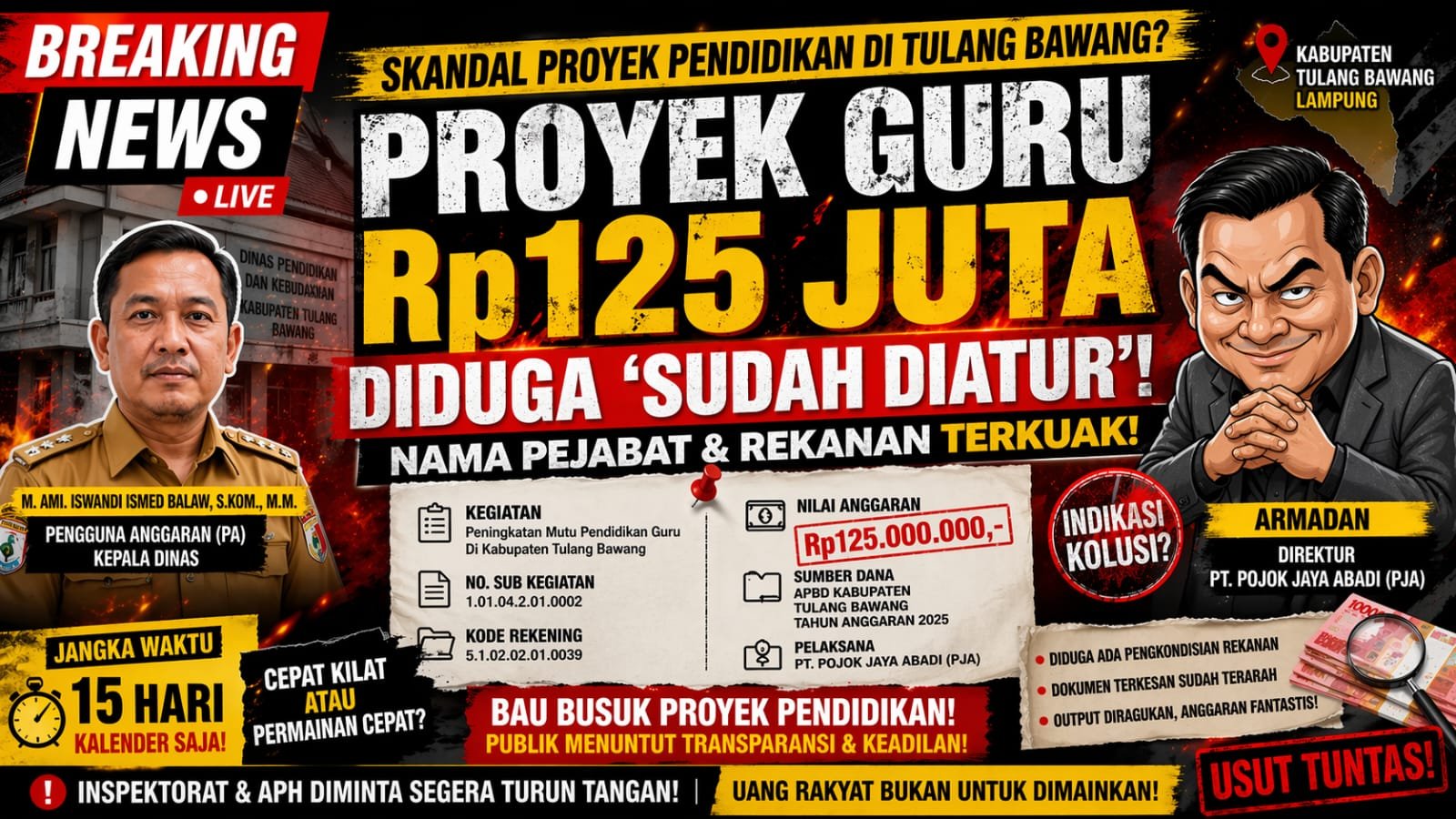 Tulang Bawang, Lampung Wah— Aroma tak sedap mulai tercium dari proyek Peningkatan Mutu Pendidikan Guru di Kabupaten Tulang Bawang Tahun Anggaran 2025. Proyek dengan nilai Rp125.000.000 yang bersumber dari APBD ini kini menjadi sorotan, setelah muncul indikasi kolusi antara pihak pengguna anggaran dan rekanan pelaksana.