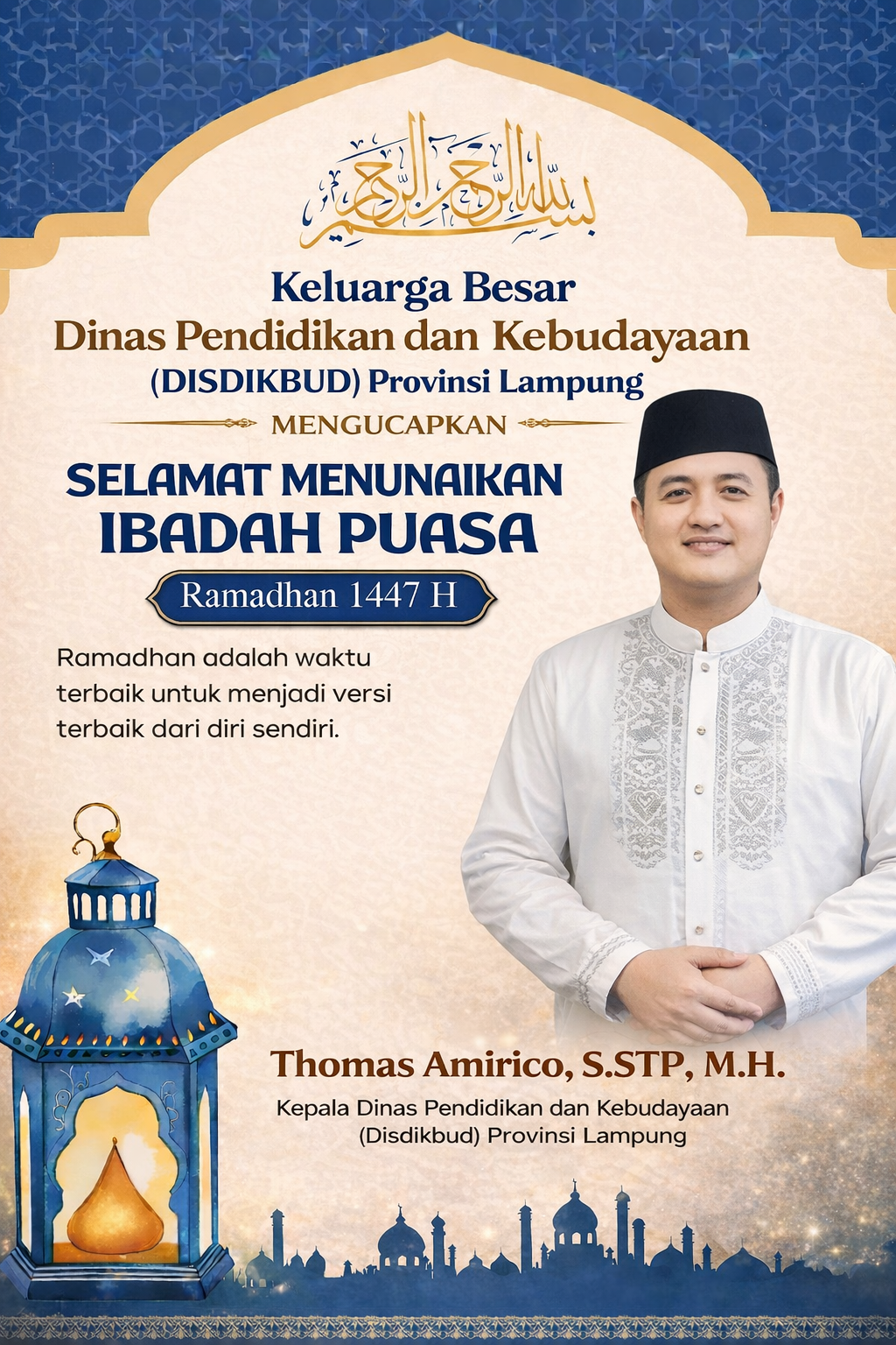 Bandar Lampung, lampungwah.info — Menyambut datangnya bulan suci Ramadhan 1447 Hijriah/2026 Masehi, Kepala Dinas Pendidikan dan Kebudayaan (Disdikbud) Provinsi Lampung, Thomas Amirico, S.STP., M.H., menyampaikan pesan sekaligus ajakan penuh makna kepada seluruh jajaran pendidikan di Provinsi Lampung.