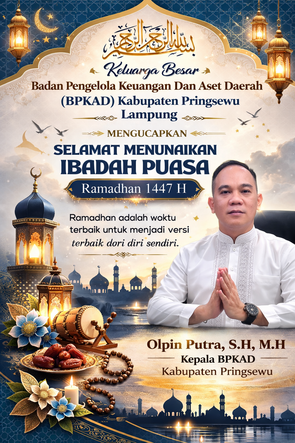 Pringsewu, lampungwah.info — Menyambut datangnya Bulan Suci Ramadan 1447 Hijriah, Kepala Badan Pengelola Keuangan dan Aset Daerah (BPKAD) Kabupaten Pringsewu, Olpin Putra, S.H., M.H., menyampaikan ucapan selamat menunaikan ibadah puasa kepada seluruh masyarakat, khususnya jajaran pemerintah daerah dan warga di Kabupaten Pringsewu.