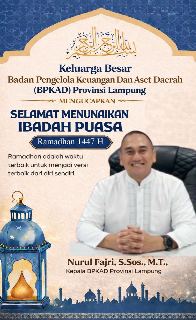 Bandar Lampung, lampungwah.info – Menyambut datangnya bulan suci Ramadan 1447 Hijriah, Kepala Badan Pengelola Keuangan dan Aset Daerah (BPKAD) Provinsi Lampung, Nurul Fajri, S.Sos., M.T., menyampaikan ucapan selamat menunaikan ibadah puasa kepada seluruh masyarakat Provinsi Lampung, khususnya jajaran pegawai di lingkungan Pemerintah Provinsi Lampung.