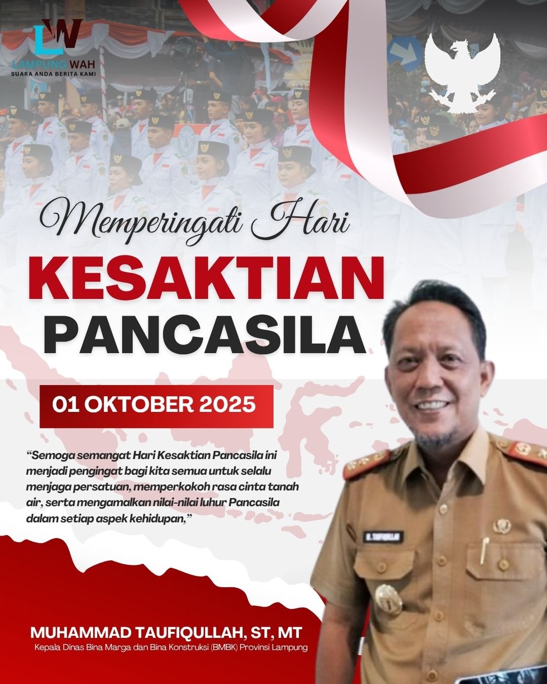 Bandar Lampung, lampungwah.info — Kepala Dinas Bina Marga dan Bina Konstruksi (BMBK) Provinsi Lampung, Muhammad Taufiqullah, ST, MT., mengucapkan Selamat Memperingati Hari Kesaktian Pancasila, 1 Oktober 2025.