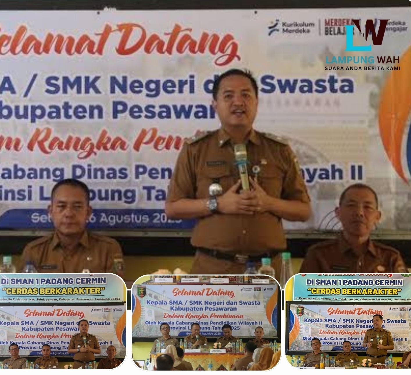 Bandar Lampung, (lampungwah.info) —- Dalam rangka meningkatkan kualitas pendidikan di Provinsi Lampung, Khususnya di Kabupaten Pesawaran, Kepala Dinas Pendidikan dan Kebudayaan Provinsi Lampung, Thomas Amirico, S.STP., S.H., melaksanakan kegiatan pembinaan bagi seluruh kepala sekolah jenjang SMA/SMK Negeri dan Swasta se-Kabupaten Pesawaran.