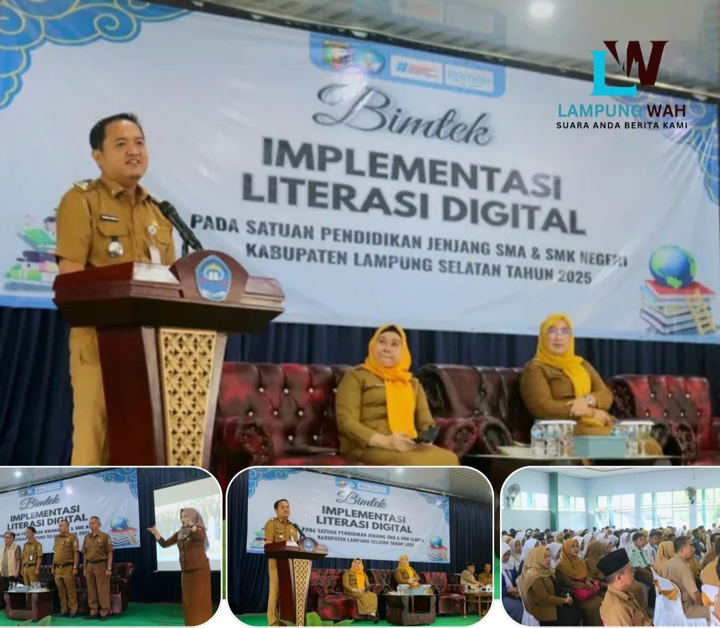 Bandar Lampung, lampungwah.info — Kepala Dinas Pendidikan dan Kebudayaan (Disdikbud) Provinsi Lampung, Thomas Amirico, S.STP., M.H., secara resmi membuka kegiatan Bimbingan Teknis (Bimtek) Implementasi Literasi Digital Tahun 2025 bagi satuan pendidikan jenjang SMA dan SMK Negeri di Kabupaten Lampung Selatan. Acara tersebut dihadiri oleh Kepala Bidang Pembinaan SMA, Diona Katharina, S.Sos., M.Pd., Kepala Cabang Dinas Wilayah I, Ketua MKKS SMA dan SMK Negeri Lampung Selatan, para kepala sekolah, serta perwakilan guru dan siswa dari berbagai sekolah. Kegiatan berlangsung di Aula SMAN 2 Kalianda pada Selasa, (7/10/2025).