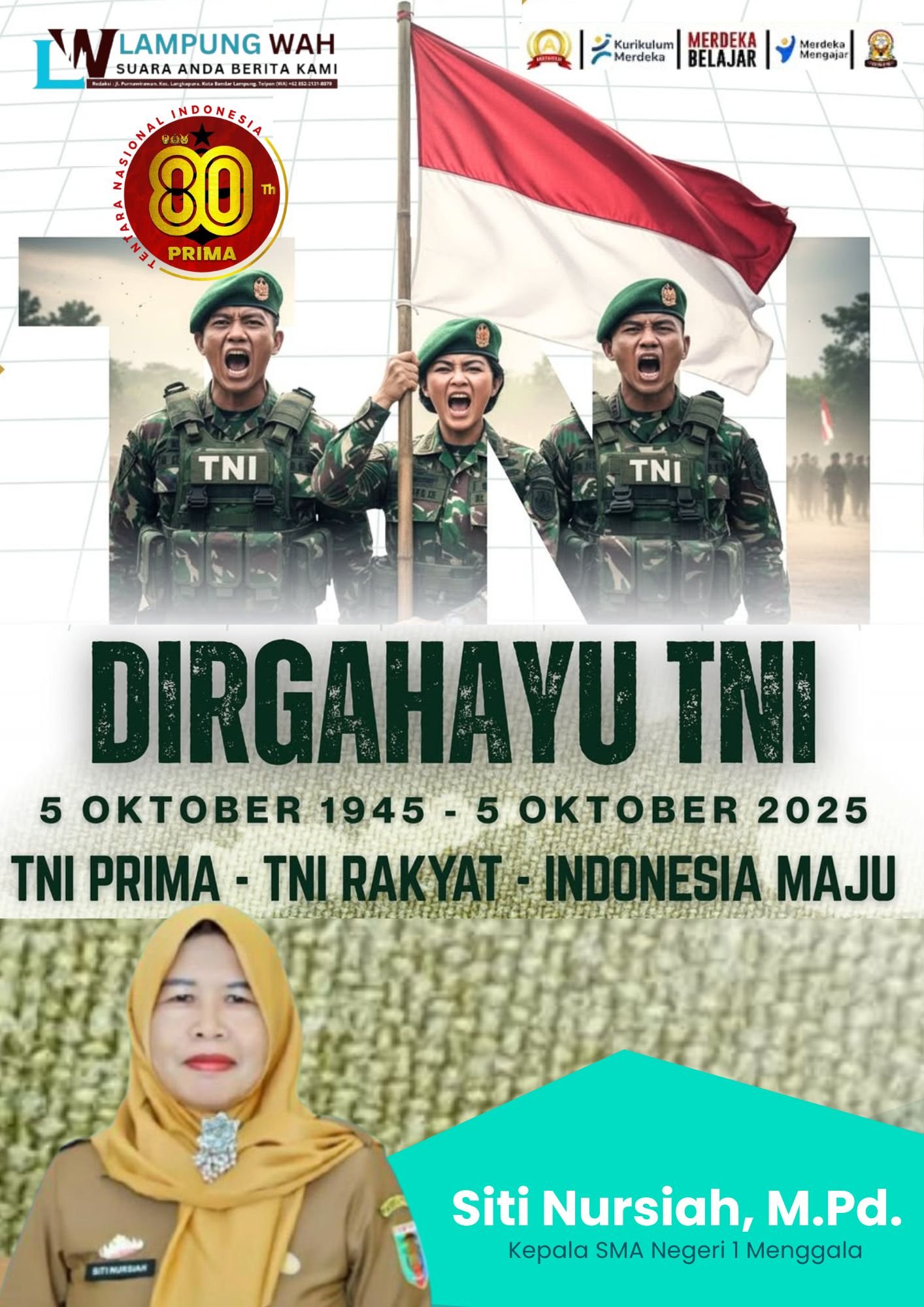 Menggala, lampungwah.info — Dalam rangka memperingati Hari Ulang Tahun (HUT) Tentara Nasional Indonesia (TNI) ke-80 tahun 2025, Kepala SMA Negeri 1 Menggala, Siti Nursiah, M.Pd., mengucapkan Dirgahayu Tentara Nasional Indonesia yang ke-80. Semoga TNI terus menjadi garda terdepan dalam menjaga kedaulatan dan keamanan Negara Kesatuan Republik Indonesia (NKRI), serta terima kasih atas dedikasi dan pengabdian dalam menjaga Indonesia selama 80 tahun.