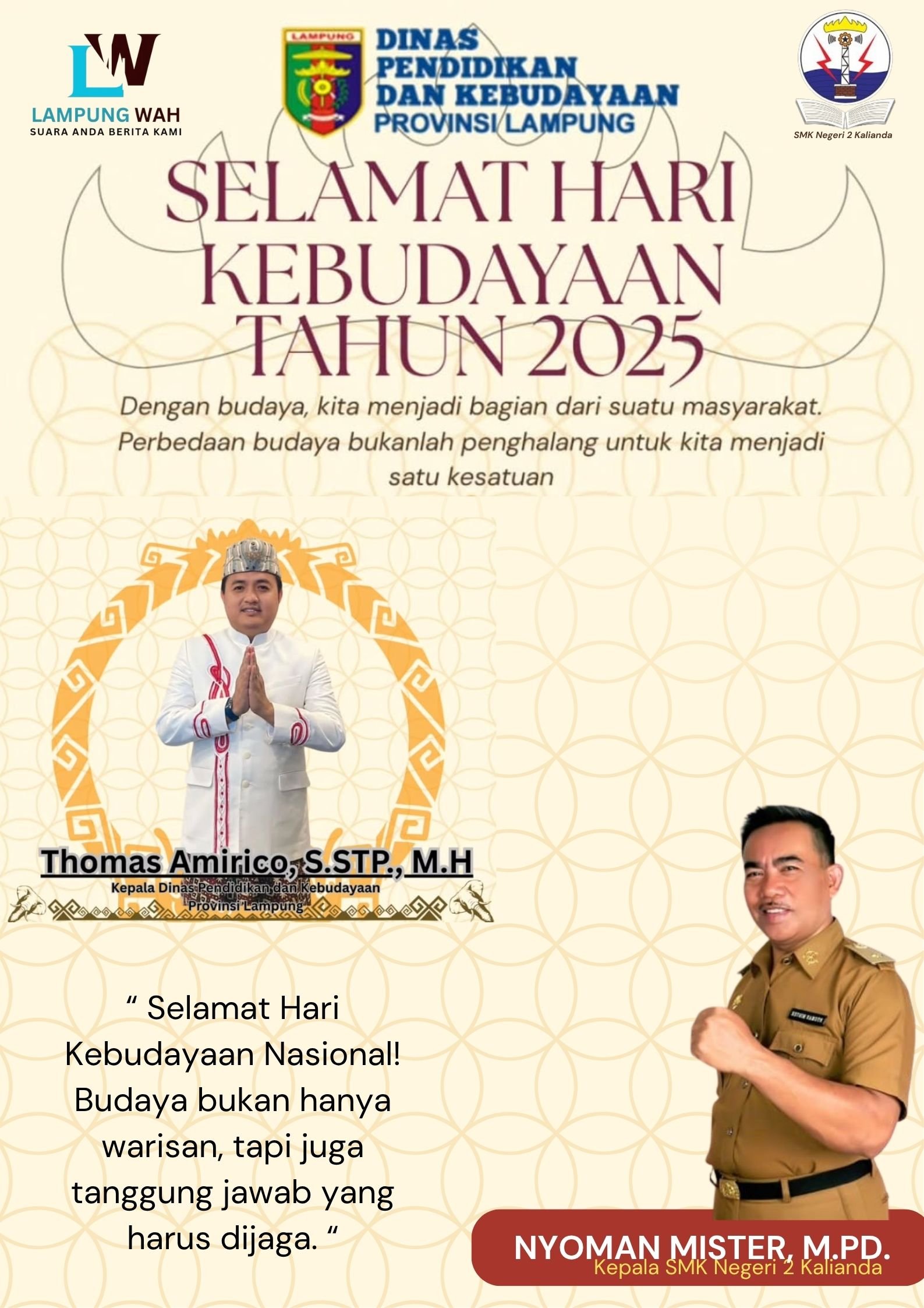 Kalianda, lampungwah.info — Kepala SMK Negeri 2 Kalianda, Nyoman Mister, M.Pd., menyampaikan ucapan Selamat Hari Kebudayaan Nasional Tahun 2025 kepada seluruh warga sekolah dan masyarakat.