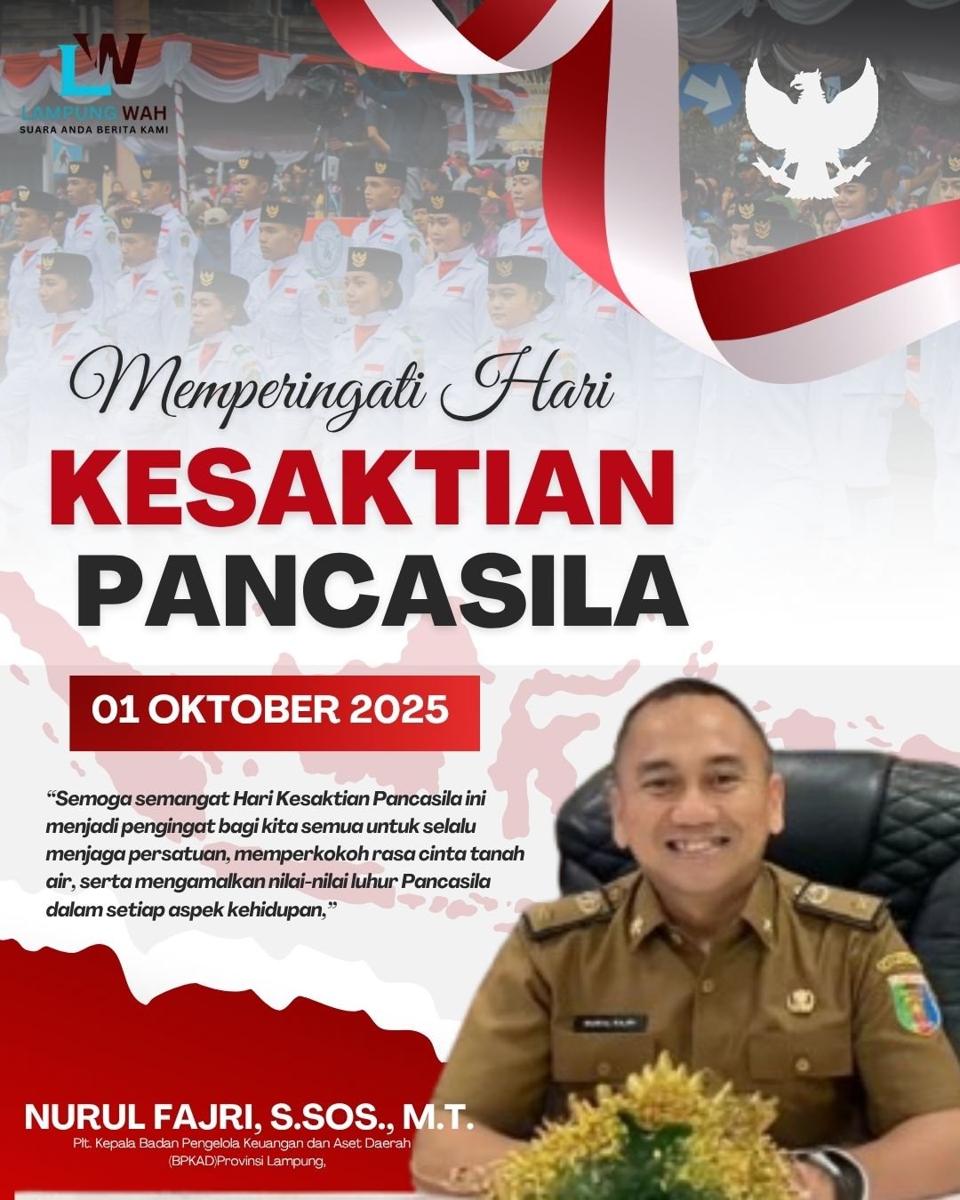 Bandar Lampung, lampungwah.info — Plt. Kepala Badan Pengelola Keuangan dan Aset Daerah (BPKAD) Provinsi Lampung, Nurul Fajri, S.Sos., M.T., mengucapkan Selamat Memperingati Hari Kesaktian Pancasila, 1 Oktober 2025. Dengan mengusung tema “Pancasila Perekat Bangsa Menuju Indonesia Raya”, Nurul Fajri mengajak seluruh elemen masyarakat di Provinsi Lampung untuk menjadikan peringatan Hari Kesaktian Pancasila tahun 2025 ini sebagai momentum memperkuat persatuan, meneguhkan semangat kebangsaan, serta menanamkan nilai-nilai Pancasila dalam kehidupan sehari-hari, khususnya pada bidang pendidikan di Provinsi Lampung. Rabu, (01/10/2025).