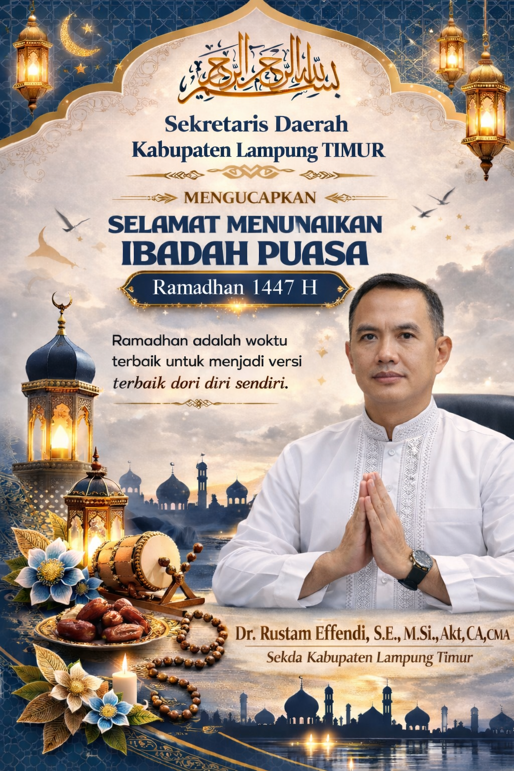 Lampung Timur, lampungwah.info — Menyambut datangnya bulan suci Ramadhan 1447 H, Sekretaris Daerah Kabupaten Lampung Timur, Dr. Rustam Effendi, S.E., M.Si., Akt, CA, CMA, menyampaikan ucapan selamat menunaikan ibadah puasa kepada seluruh umat Islam di Kabupaten Lampung Timur. Dalam pesannya, Sekda menekankan bahwa Ramadhan bukan hanya tentang menahan lapar dan dahaga, tetapi juga momentum untuk memperbaiki diri, memperkuat integritas, serta meningkatkan kepedulian sosial.