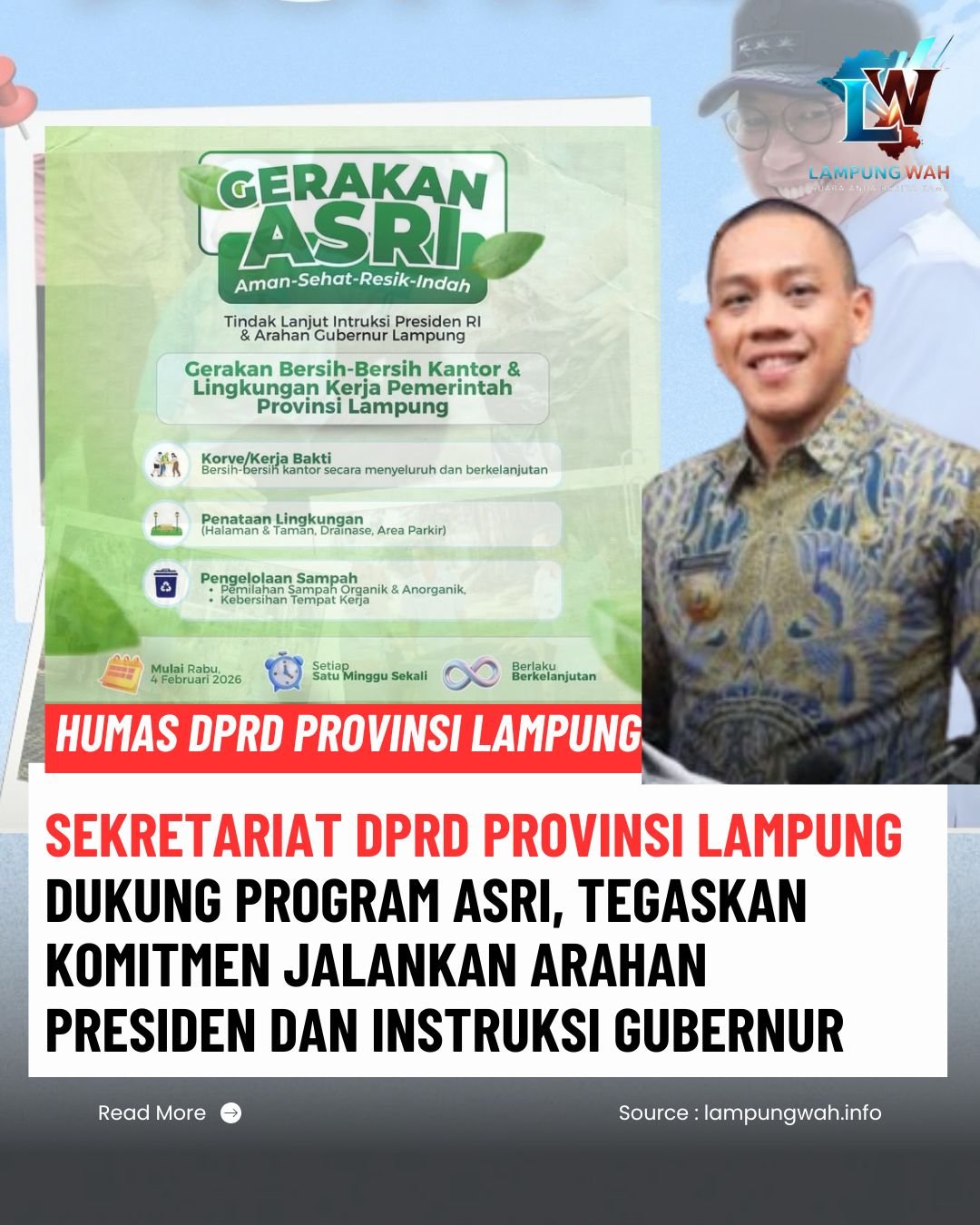 Bandar Lampung, lampungwah.info — Sekretariat DPRD Provinsi Lampung di bawah kepemimpinan Sekretaris DPRD, Descatama Paksi Moeda, S.T., S.E., M.M., melaksanakan kegiatan bersih-bersih lingkungan sebagai bentuk dukungan terhadap Program Gerakan Aksi Aman, Sehat, Tertib, dan Indah (ASRI). Kegiatan ini digelar pada Rabu (4/2/2026) sebagai tindak lanjut atas arahan Presiden Republik Indonesia mengenai penguatan Program Bersih Nasional serta Instruksi Gubernur Lampung Rahmat Mirzani Djausal, S.T., M.T., Nomor 8 Tahun 2026 tentang Gerakan Bersih-Bersih Kantor dan Lingkungan Kerja (KORVE).