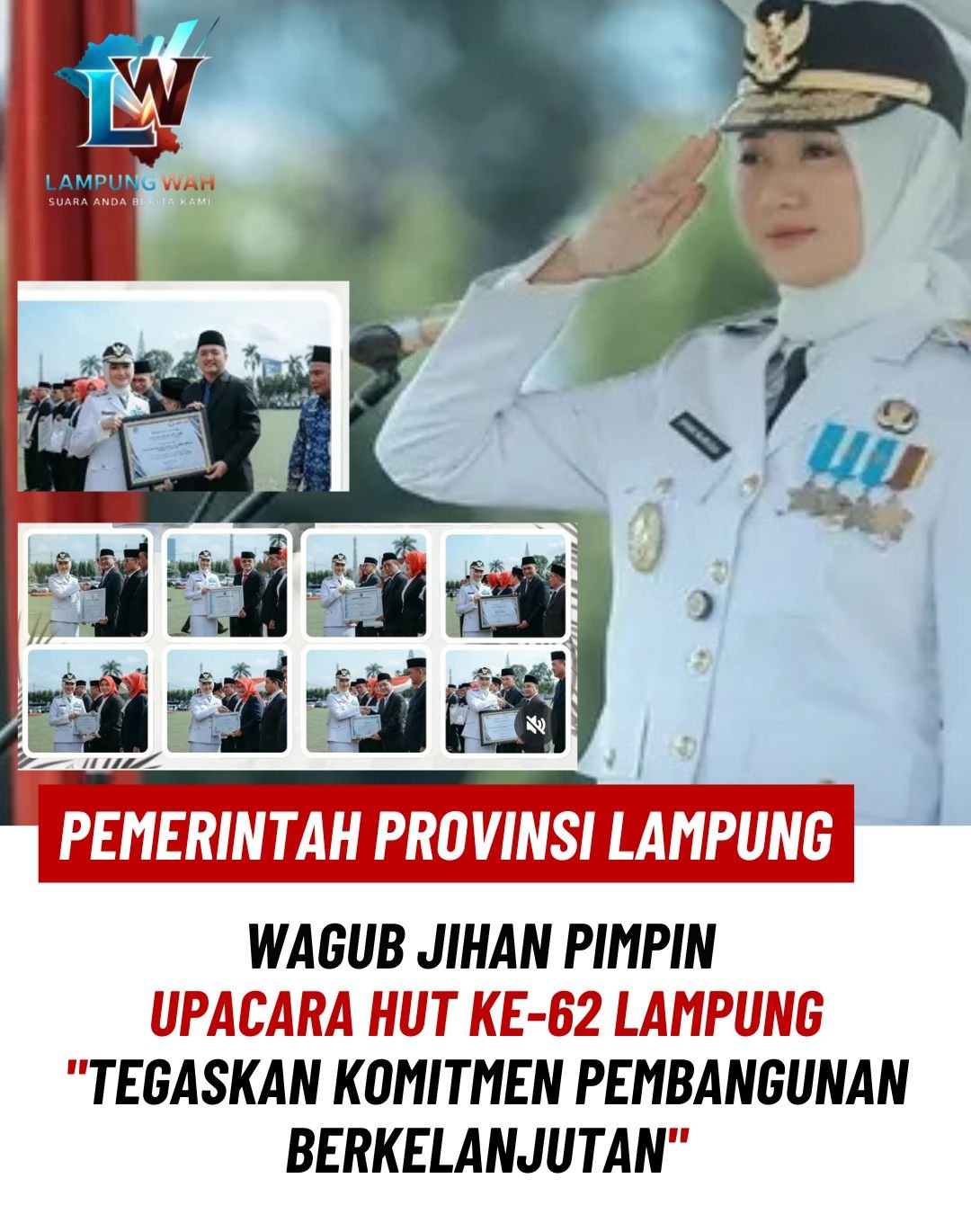 Bandar Lampung, Lampung Wah – Wakil Gubernur Lampung, Jihan Nurlela, memimpin upacara peringatan Hari Jadi ke-62 Provinsi Lampung Tahun 2026 yang berlangsung khidmat di Lapangan Korpri, Kantor Gubernur Lampung, Selasa (31/03/2026).